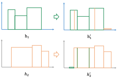 - 步骤三:由于“分割点”不一致,我们无法直接根据直方图计算PSI,因此对直方图进行分割,使得当前周期直方图和上一周期直方图的分割点一致,取h1、h2直方图分割点的并集作为新分割点,按照新的分割点重新划分直方图得到h1`、h2`;