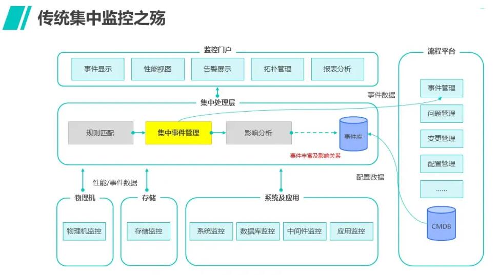 正因为存在这些不足,传统集中监控往往是上线初期耳目一新,但经过一段时间使用后,仍然呈现出“没什么故障时,事件很少也没有人看,故障一旦发生时事件多得看不过来”的尴尬局面。