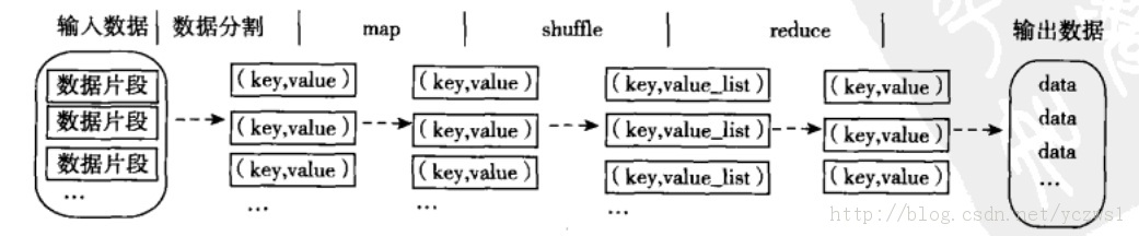 流程简而言之,大数据集被分成众多小的数据集块,若干个数据集被分在集群中的一个节点进行处理并产生中间结果。单节点上的任务,map函数一行行读取数据获得数据的(k1,v1),数据进入缓存,通过map函数执行map(基于key-value)排序(框架会对map的输出进行排序)执行后输入(k2,v2)。每一台机器都执行同样的操作。不同机器上的(k2,v2)通过merge排序的过程(shuffle的过程可以理解成reduce前的一个过程),最后reduce合并得到,(k3,v3),输出到HDFS文件中。