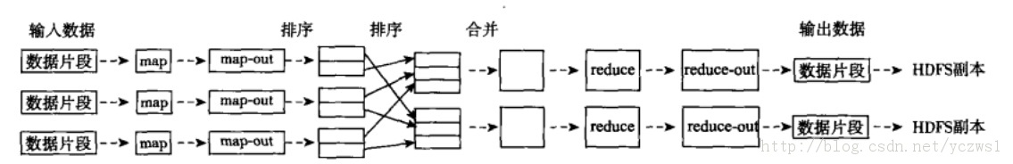 Map任务的中间结果在做完Combine和Partition后,以文件的形式存于本地磁盘上。中间结果文件的位置会通知主控JobTracker,JobTracker再通知reduce任务到哪一个DataNode上去取中间结果。所有的map任务产生的中间结果均按其key值按hash函数划分成R份,R个reduce任务各自负责一段key区间。每个reduce需要向许多个map任务节点取的落在其负责的key区间内的中间结果,然后执行reduce函数,最后形成一个最终结果。有R个reduce任务,就会有R个最终结果,很多情况下这R个最终结果并不需要合并成一个最终结果,因为这R个最终结果可以作为另一个计算任务的输入,开始另一个并行计算任务。这就形成了上面图中多个输出数据片段(HDFS副本)。