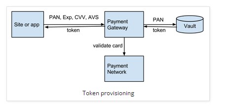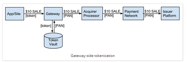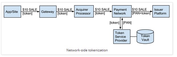 电子商务的开发者应该对信用卡密钥概念非常熟悉,工作模式是根据用户编码信息返回一个令牌用于身份认证。这些密钥信息通常来源于电商支付网关,同时也用于进行信用卡用户信息归档。我们把这种方式称为网关端的令牌化。这种令牌的特征是只作用于单一商户,好处是当就一个信用卡记录进行归档时无须进行大负荷的用户信息安全检阅。