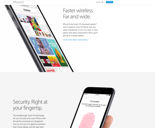如果对比苹果网页的界面,iPhone6延续了iPhone5s的风格,图片变大了,用了更细的字体(扁平化),字号也更大了,这和现在互联网信息流图片化趋势,视觉上引起张力的表现。