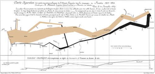 Tufte最著名的例子, Charles Minard的1869年的信息图“拿破仑在莫斯科的3月”,清晰的展示了6方面的信息。