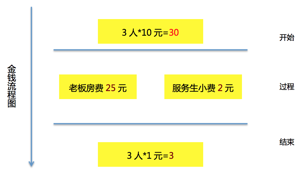 按照金钱的流向,三个房客共流出了30元,在流通过程中,老板获得25元,服务生获得2元,最终还剩余3元流回到房客手中,满足30=25+2+3*1等式。