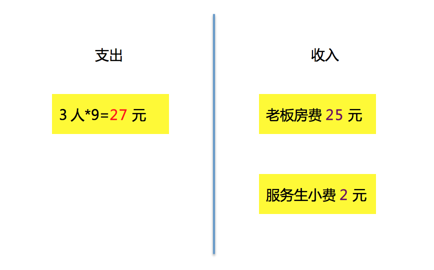 无需考虑中间的各种过程,从财务支出端看,3个房客支出27元;从收入获取端看,其中老板获得25元,服务生获得2元,27=25+2,等式成立。