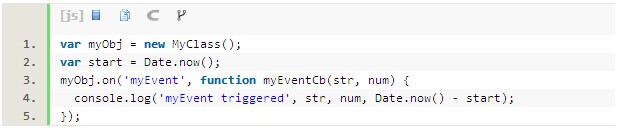这里要注意的是,订阅的EventEmitter事件虽然是异步事件,但当时间触发时,监听方的动作是会同步的。因此如果上述myEvent事件有10个监听者,所有的监听会被按次序调用而不用等候事件的循环。