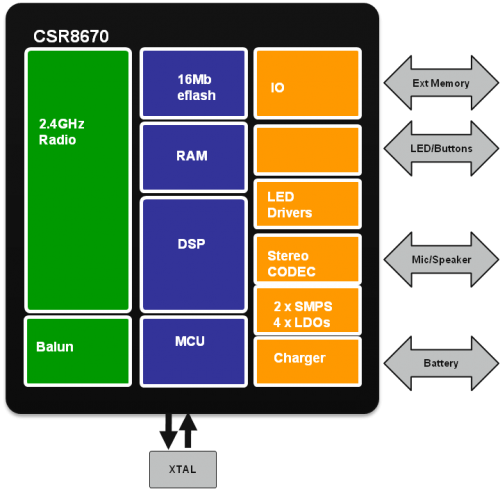 事实证明,这些设备使用的技术在三年前就已经和大家见面了,那就是CSR8670。“赋予这些微型新设备功能的硬件就是CSR8670蓝牙芯片,我们领先的基于芯片平台上音频系统的flash,”CSR音频营销高级经理Kevin Carey在采访中表示,“它集成了先进的无线链接嵌入式闪存和许多其他功能,让制作商可以去设计领先的无线耳机和扬声器。”
