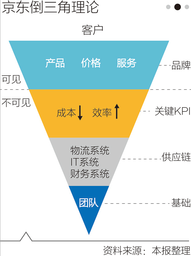 刘强东说,这个倒三角形体系“京东是从下往上发展的,也就是说团队的选人、用人、培养、激励等永远是我们最重要的事情,我们也在花时间、不计代价地去做团队”。