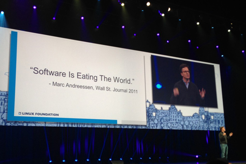 随后,来自Linux 基金会的执行官 Jim Zemlin上台,两大开源巨头在巴黎首度同台,我们看到了是开源力量的伟大,更多的朋友敬重开源,拥抱OpenStack,这一切都源于开源精神。似乎所有人都不再谈论Linux了,更多的都在说OpenStack,Jim调侃着来到大家面前,他今天的演讲主题是“开源改变科技”,开源技术在某种程度上重新定义了科技的边界,这背后的原因在于开源技术正在吞噬软件世界。当今世界,用户正在寻求一种更快,更简单,更轻量级的方式开发自己的软件,目前的IT企业中,80%的代码来源于开源世界,这意味着传统用户花费太多经费和资源在调研等工作上,这部分都不是公司利润的来源,真正重要的是用户在80%外所做的工作,这也是开源力量的伟大。