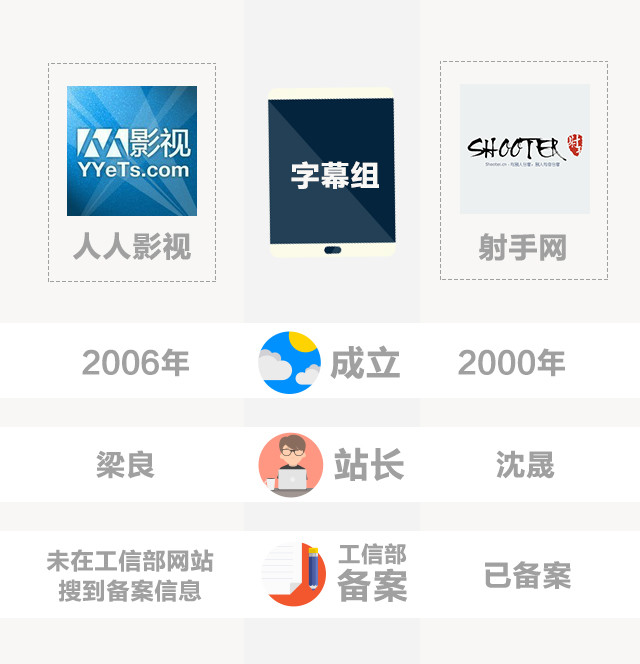 其中,人人影视这个大组于2006年6月1号正式建立独立论坛,但在工信部网站并没有搜到相关记录;而射手网是国内最大的中文字幕发布平台,于2014年3月12日正式通过工信部审核,备案主体显示"上海射手信息科技有限公司"。