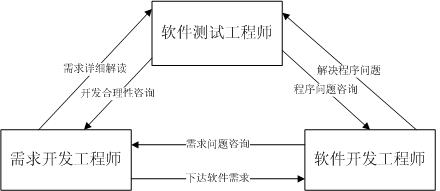 在实际的软件开发项目中,需求开发工程师、软件开发工程师和软件测试工程师之间的交流是很频繁的,如图2所示。