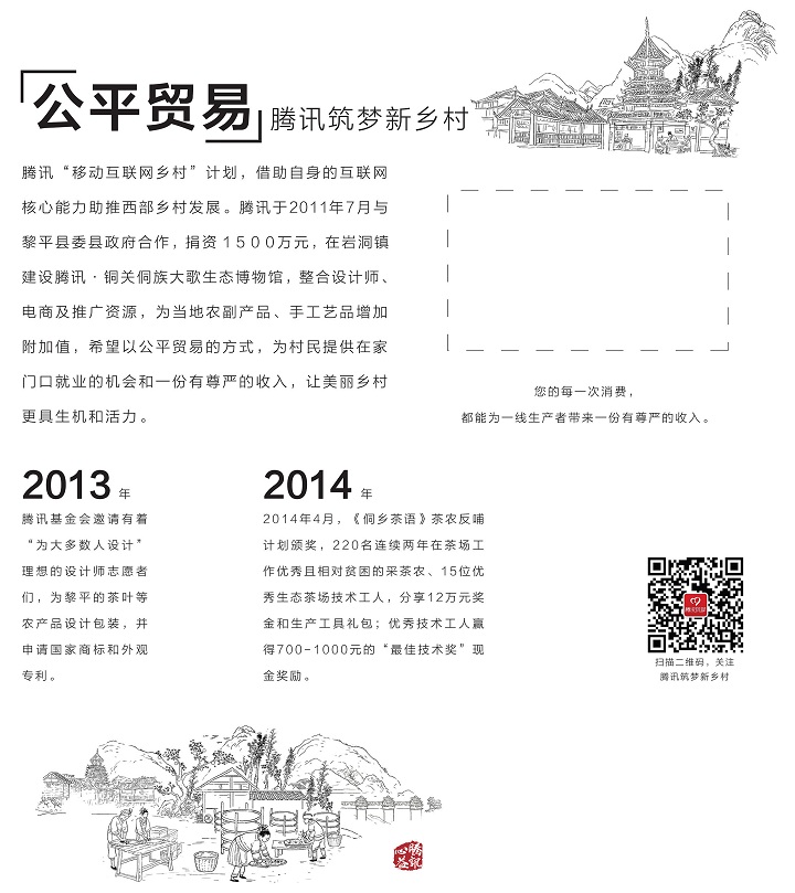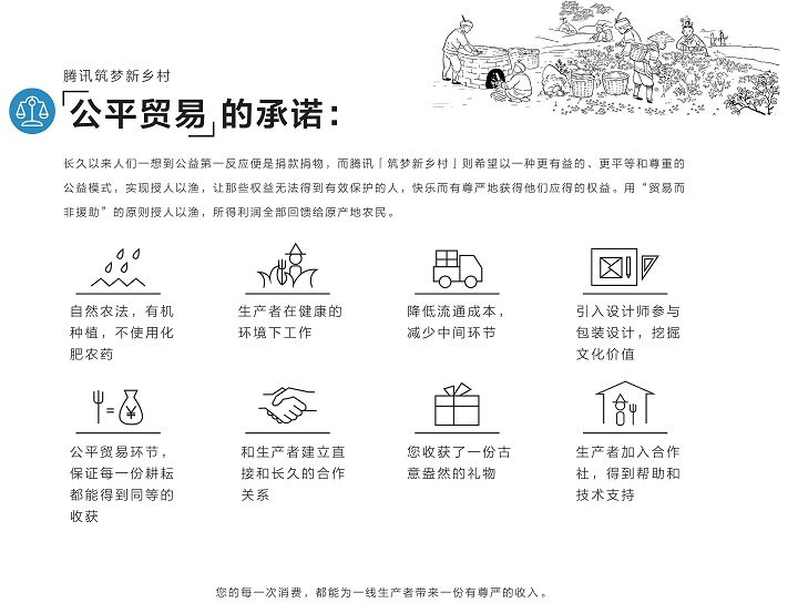 大山里淳朴的村民,不懂得电脑和互联网,只会用大自然的馈赠原生方式保存下来。一边是超市里的你,一边是大山里的他……为了帮扶边远山区挖掘优势资源(农副产品,传统手工艺等),CDC的设计师们用业余时间义务进行包装设计,以及借助腾讯的网络力量进行推广销售。销售过程中所获得的利润,原数交还到当地村民手中。在这一来一往的过程中,也教会他们如何与“山外人”打交道和互联网的操作经验。实现“授人以渔”的公益帮扶目的。