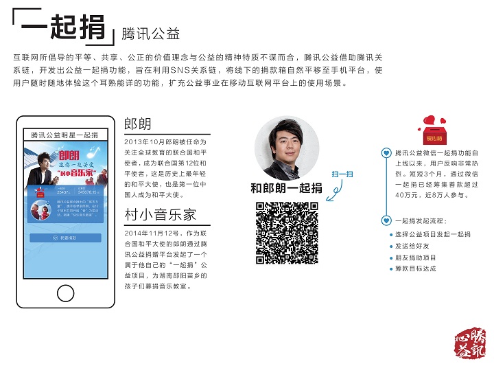 互联网众筹的合作模式,让我们有了更多创新和设计的可能性。驾着互联网社交强需求的马车,我们在尝试的创新型公益在线捐赠产品——通过个人(尤其是公众人物)和企业自身的影响力,以及微信社交关系链而实现的公益项目的众筹。我们寄希望于加深大众与公益项目之间的信任连接,提升公益劝募及传播的效率和效果。通过前期上线后的观察,“一起捐”对于突发公益事件的善款募集时间是以往传统公益募集的四分之一。同时也受到公益界人士的肯定和支持,被形容为“公益在移动互联网时代的新创举”。多家机构发表针对“一起捐”特性的专项研讨文章,带动公益行业出现了一轮拥抱移动互联网创新公益的新浪潮。遇到需要公益帮助的紧急事件了吗?记得试试“一起捐”哦!