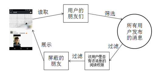 先说一下我的答案:在发布时的权限控制是不会考虑屏蔽的人的。前面我们讲了,在消息发布的时候,服务器会根据用户设置的权限信息,将消息有选择的放到有权限阅读人的timeline中。如果这个时候需要考虑屏蔽的人的话,那就还要去读取每个有权限阅读的人的屏蔽人清单,然后根据每个人的清单去决定是不是放到这个人的timeline中,显然这又会增加多大的计算量。那么有人就要问了,那怎么实现屏蔽的功能呢?两种方法实现,一种是在这个用户刷新朋友圈时,将读取到的自己的那份timeline数据(含屏蔽人的消息),在服务器端过滤掉屏蔽人的消息;另外一种则是读取的时候,服务器端按照原样下发给客户端,客户端根据存储的屏蔽清单来过滤,被屏蔽的则不显示给用户。两种方法在实现效率上几乎没有差别,通过对于微信的使用体验来看,我倾向于这个是由客户端来过滤的。实际这也可以有方法去验证,这里就不做了。这种屏蔽方案也是基于上面提到的“把需要大计算量的过程分散到平时零散的时间去做”。