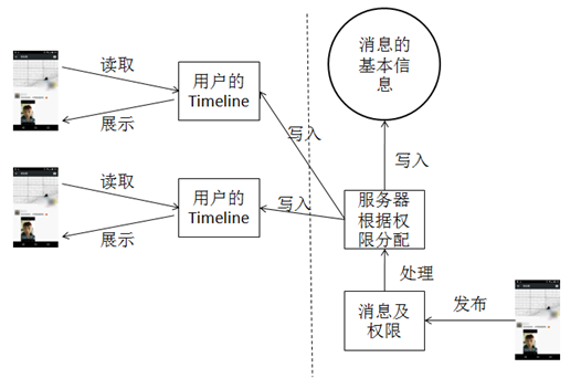 当一个用户发布一条消息时会按照上面讲的标签设置相关的权限,服务器就会给每个有权限接收这条消息的用户的timeline中写入这条消息。也就是在用户发布的这一刻,就做好了权限安排,而不是等到读取的时候。这样就自然减少了读取的时候的计算量,提高了效率。