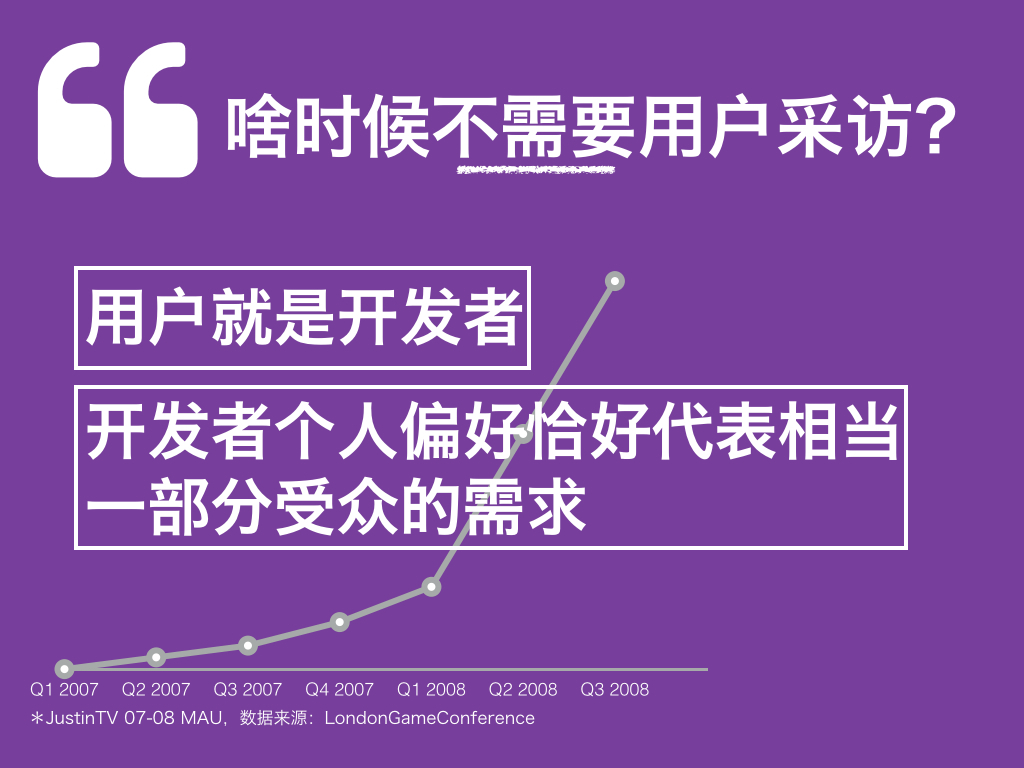 的生活,并实时发布在网站上。网站后来衍生为多用户生产内容 (UGC) 的视频网站。于是开发者就成为了内容生产者,也成为了产品的终端使用者。无疑,在这种情况下,你可以大胆地跳过用户调研