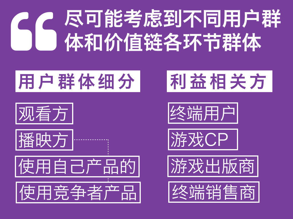 / 播映方,和只用过竞争对手产品的内容制作 / 播映方。在利益相关方方面,他们找到直播工具开发商,电竞游戏