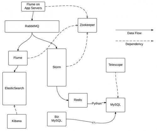 RabbitMQ的消费者除了Storm外,还有Elastic-Search(ES)。使用ES来做日志的全文检索,包括Nginx日志和PHP错误日志,因为Nginx日志的计算只能帮助运维人员和开发人员定位到某个域出问题,再深入地分析,就要从出错时的日志入手了。我们的日志还会有一份全量流入HDFS,原本用日志的搜索直接从HDFS来获取,但发现用Hive查询速度非常慢,大约需要几分钟。ES是基于Solr的一个全文检索引擎,有一个很好用的前端Kibana。在这次大促中,由于前端的RabbitMQ挂了,所以ES没有受到很大的压力。