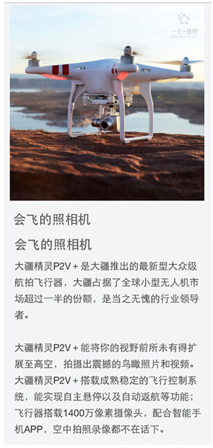 最后一句:“飞行器搭载1400万像素摄像头,配合智能手机APP,空中拍照录像都不在话下。”我想很多“非航拍or摄影爱好者”和我有一样的感觉:最后一句话,和我们最有“接近性”。因为“智能手机”、“像素”、“APP”都是我们每天接触的具体事物。
