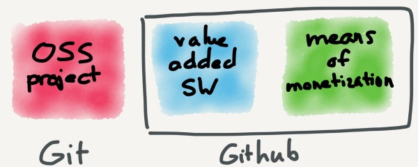 而GitHub在探索一条更适合于当前的模式,Git是由Linus设计的开源项目,GitHub是基于Git的增值服务,通过SaaS或企业级产品的模式提供。但是相比红帽,它将增值项目和货币化方式合二为一了,也就是说想要使用其提供的增值项目(这里指私有项目的托管,公开的项目是免费的),你必须要付钱。