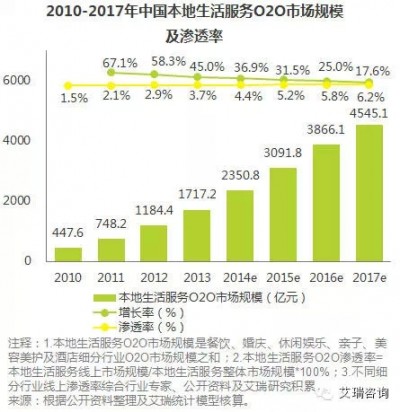 P2P模式极大地激活了本地化生活服务O2O市场的大量长尾需求。据艾瑞咨询统计数据显示,2013年本地生活服务O2O市场规模超过1700亿元,同比增速45.0%,目前在整个本地生活服务市场中的渗透率还较低,不足4%。本地生活服务O2O市场自身的增长速度较快,将有望成为下一个过万亿级的线上市场。