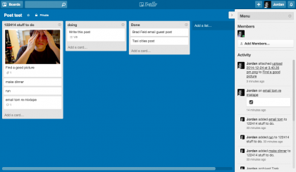 Trello上的工作都围绕“board”进行,同一小组的用户可以在这里创建待办事项列表(to do list)、创建任务,并分配给同事,当同事完成工作后可以把任务状态标记为完成,类似于producteev。你可以为每个项目创建一张卡片,里面包括活动、附件、更新、沟通内容等信息。你可以把同事拖拽到这些卡片中,然后把卡片拖到列表里。