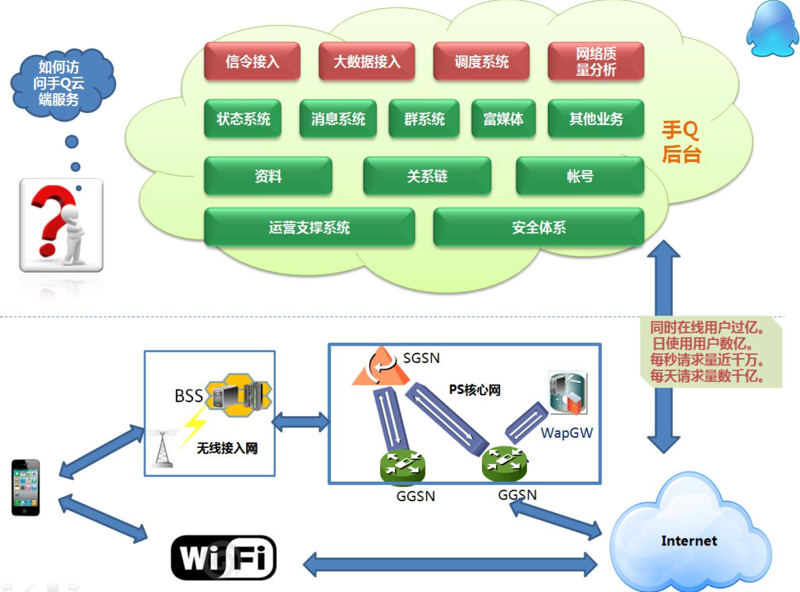 下图包含了云、管、端三个部分,多种终端通过多种网络访问云端的服务。上面红色部分是接入层,是首先会受到影响的。下面是逻辑存储、运营支撑和安全体系,这个系统目前终端同时在线过亿。终端每秒的请求量差不多千万,一天的请求量在数千亿的量级。
