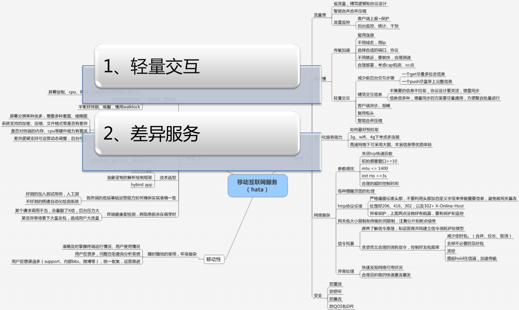 能不差异的地方就不差异,考虑全面些。设计的时候要考虑全面,要把各种平台、各种网络都考虑到。在选择压缩算法、加密算法、图片格式和文件格式时,这些东西能通用的还是尽量通用,不要给自己找麻烦。如果有些地方没法统一,必须要差异,这里要抽象简化,简化为几大类,而且这个差异点尽量使后台可调可控。