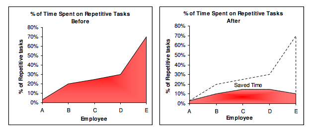 和 70% 时间花在重复性工作上,经过 2 个月的生产力强化(引入自动化软件)后,时间相应降至 3%、10%、15%、15%