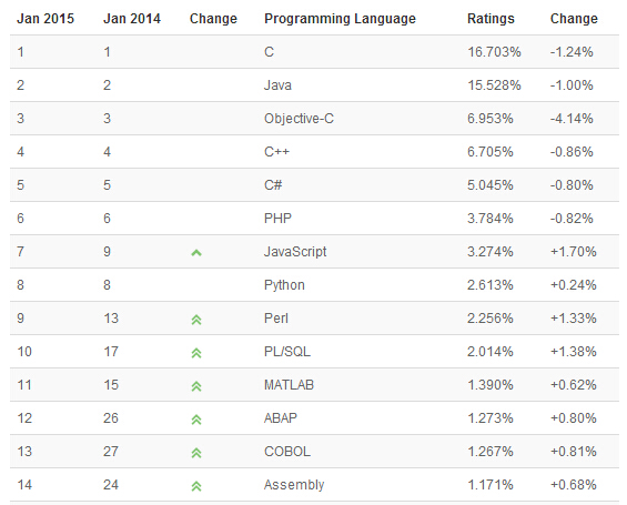 TIOBE 2015年1月编程语言排行榜:JavaScript成大赢家 |
