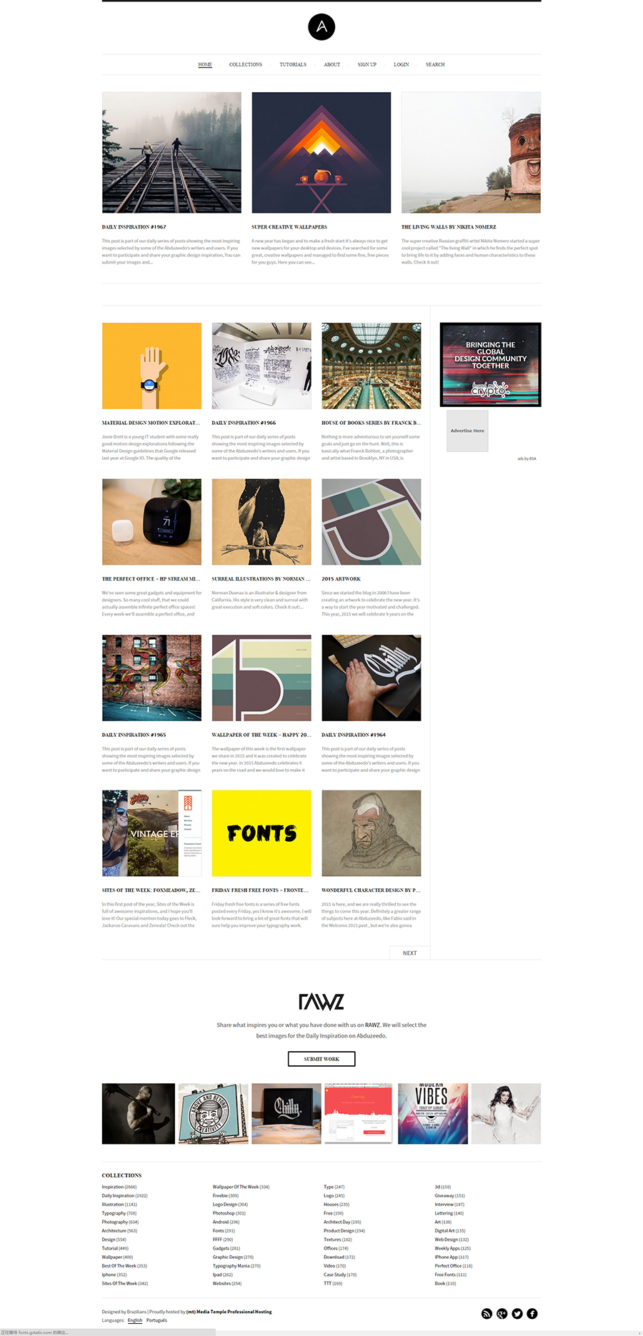 呈现内容间的关系——按照一定的布局去展示网站的主次内容优先级,比如abduzeedo这个网站,就将主推的内容放在了最大的顶部三个卡片展示上,其他的普通内容则在下方以列表的方式展示,底部则是一些标签分类的链接。