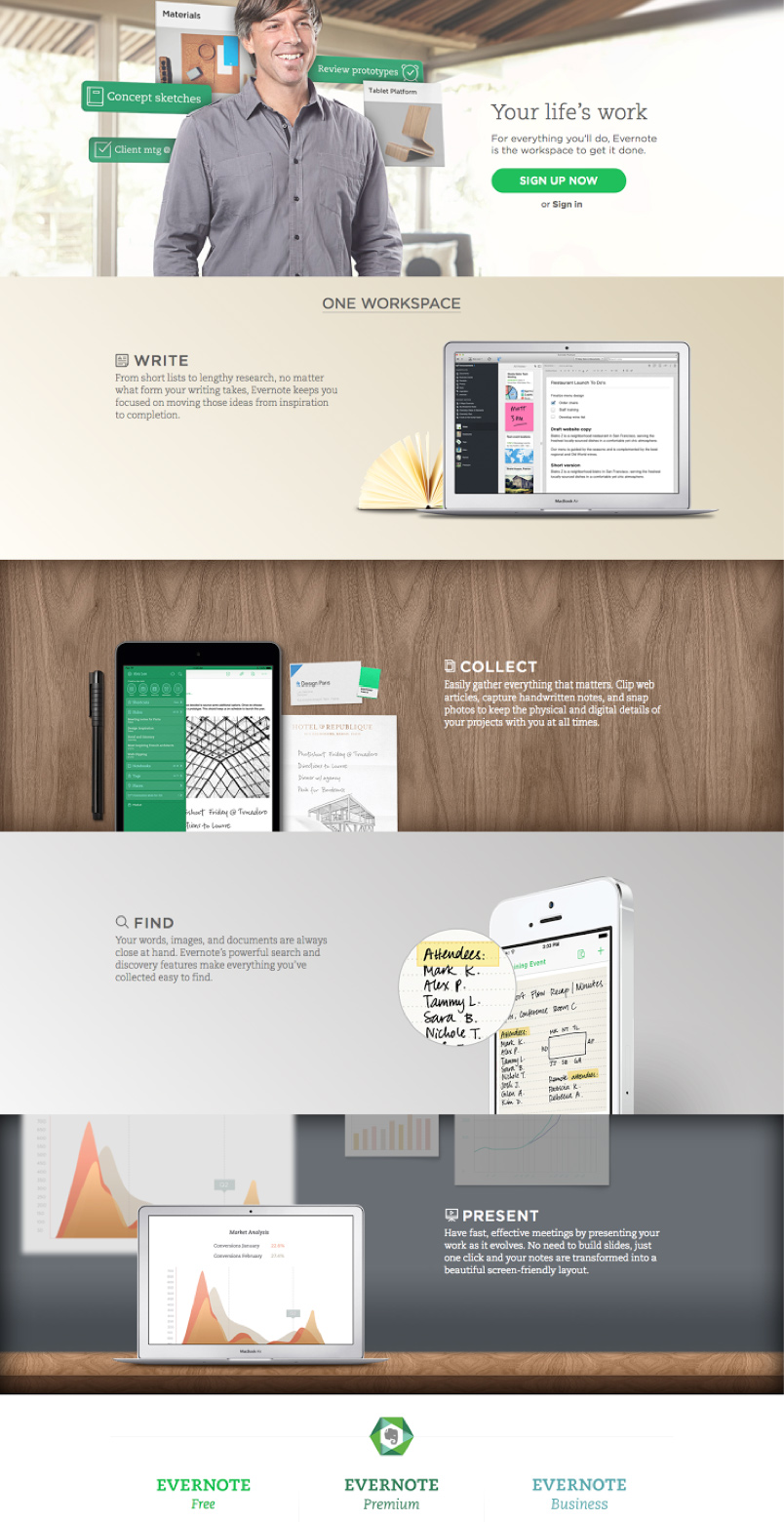 你可以在整个页面不断重复Z模式的规律,就像你在下图中看到的那样,一开始这个页面就有一个注册按钮,通过水平位置的浏览,用户已经获悉了这一信息,下拉会出现产品的卖点,这些卖点的展示就是遵循重复着Z模式的最佳例子,直到最下方的支付选项就抵达了Z模式的最尾部那个水平线。