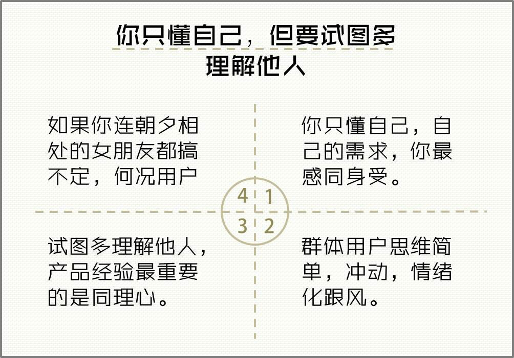 试图多理解他人,产品经理最重要的是同理心。群体用户思维简单,冲动,情绪化跟风,不管后台多复杂,在用户面前呈现的必须简单。