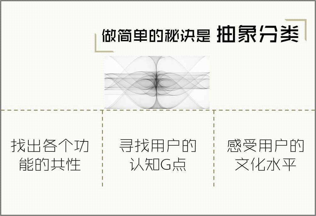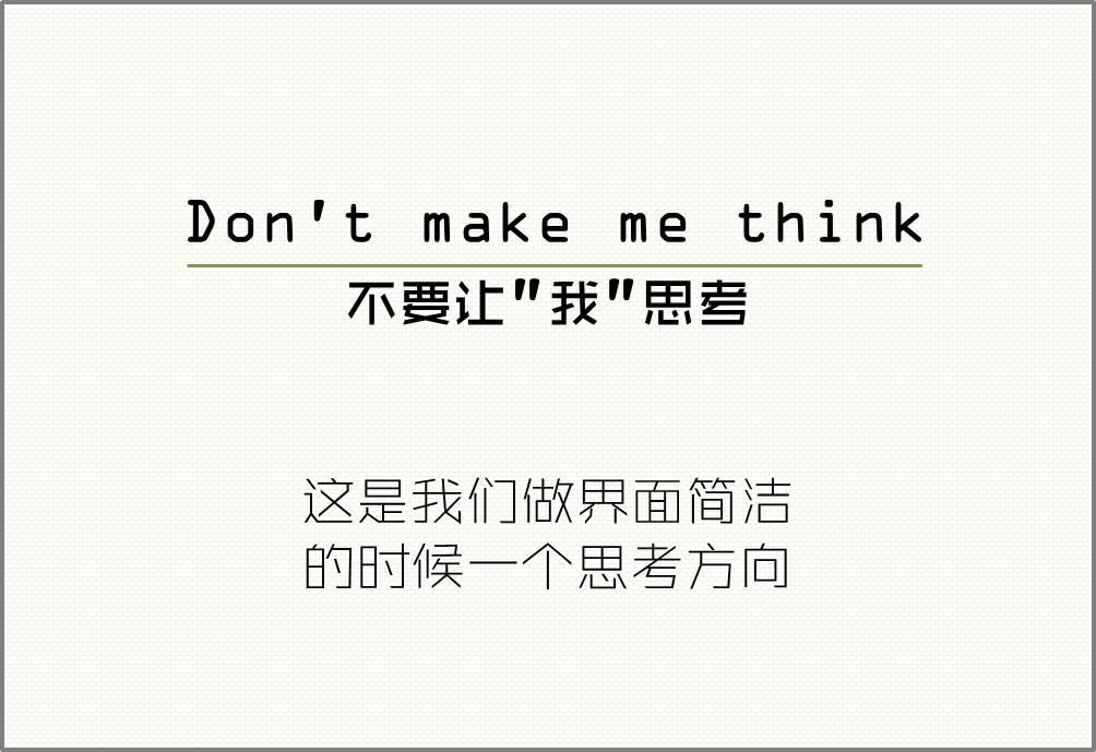 Don't make me think(不要让我思考),这是产品经理做界面设计的时候一个思考方向。做简单的秘诀是“抽象分类”,即找出各个功能的共性、寻找用户的认知G点、感受用户的文化水平。