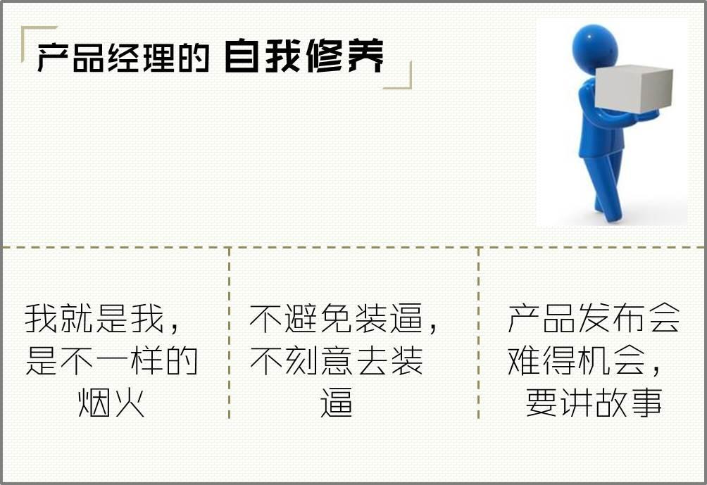 产品经理的自我修养三秘诀是“我就是我,是不一样的烟火”、“不避免装逼,不刻意去装逼”、产品发布会是难得机会,要讲故事“。