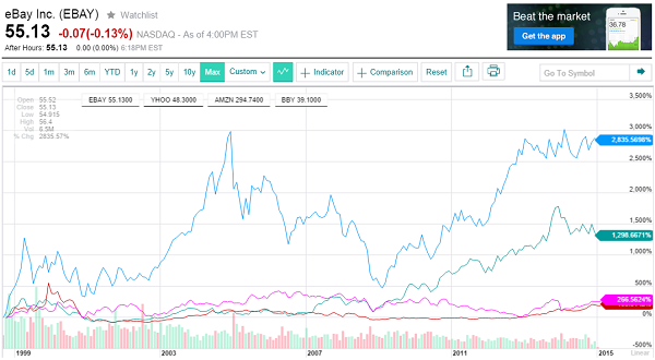 在2002年,15亿美金是一笔巨款,但是十几年后的今天,Paypal成为eBay最值钱的资产,仅仅根据2013年数据,Paypal为eBay贡献了41%的营业额,假如没有了Paypal贝宝这个网上支付巨头,eBay的股价至今都不可能回到家乡。