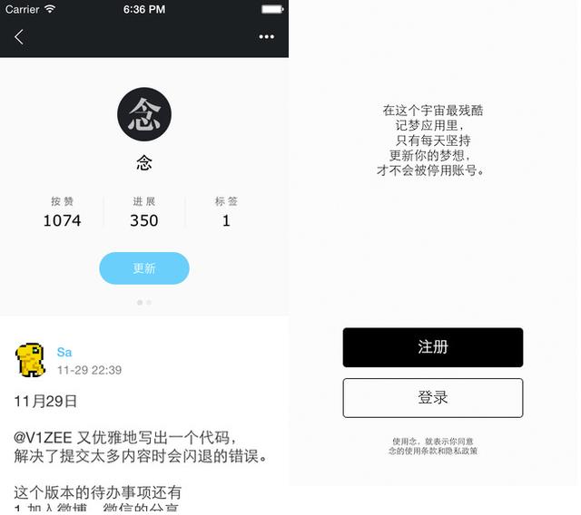 5.念:这是一个残酷高冷又清新的APP。你可以记录每天要坚持做的事情,无论是编程、绘画、日记或学习新的语言。一旦开始就不能停止,假如有一天忘记更新,你的账号就会被冻结,只能付费恢复。