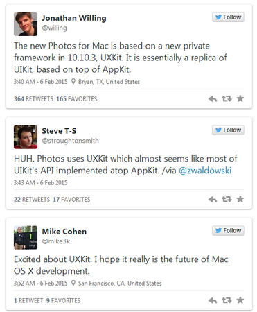 苹果面向所有测试用户及开发者发布了OS X 10.10.3的首个预览版,同时还带来了新版本的Photos应用。而让开发者颇为意外的是,在此Mac版的Photos中,苹果使用到了一款全新的基于AppKit实现的私有框架,名为UXKit,该框架类似于UIKit的API,包含UXNavigationController、UXView、UXControl、UXCollectionView、UXTableView、UXLabel以及UXImageView等。