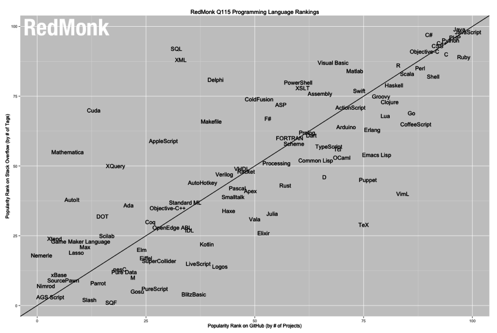 2015年RedMonk语言排名是通过对GitHub和StackOverflow活跃进行分析,研究结果为: