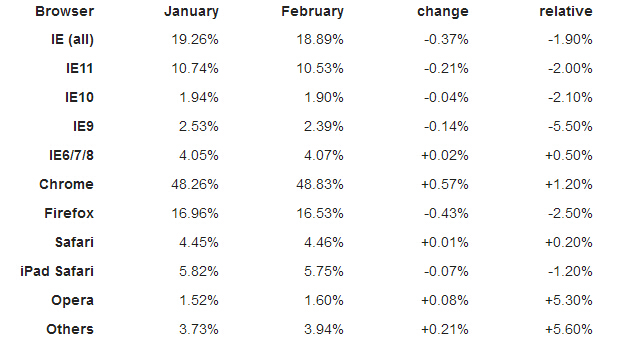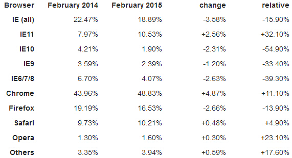 2014年2月-2015年2月全球性桌面&平板电脑浏览器统计数据