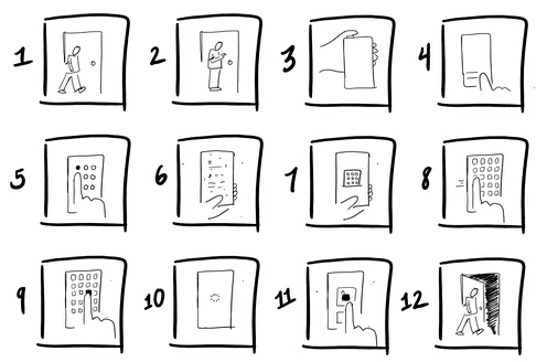 听起来令人销魂,然而却需要更换特殊的插销。初始的解决方案局限在手机屏幕上,要求用户每天进行繁琐的操作,基于屏幕的思路并不比传统的门锁搭配钥匙方便。用户需要按以下步骤完成目标: