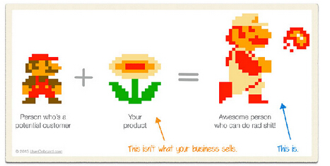 马里欧(潜在顾客)+火之花(您的产品;不是卖点)=可以丢火球的加强版马里欧(让顾客变得更好;这才是卖点)
