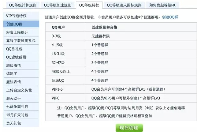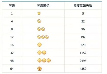 有了量化模型,对于处于不同等级的用户,就要给与之相应的奖励。这个也是用户成长模型中最难的环节,奖励太少起不到作用,奖励太多企业难以负担。QQ有一套系统的奖励机制,不过感觉感知力度在明显下降。从个人多年的使用历程来看,QQ等级最吸引我的就是图表等级(四颗星星一个月亮,四个月亮一个太阳)和建群特权(实用的功能)。