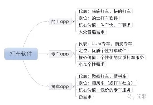 综上,的士打车降低打车门槛,缩短打车时间,需求很明确;专车打车定位高端用户,把握小众的高利润市场,有发展前景但容易受政策影响;拼车打车需求场景小,使用成本高,很难形成规模化,在难以收拢大批用户的基础上,拼车app可能会放弃该市场。