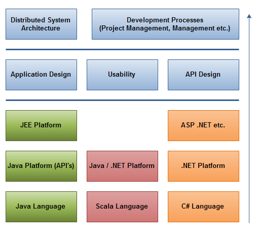 下面是如何成为专家级开发人员的示意图。从底部开始一步一步往上走。蓝色层是平台独立层。其他颜色的是平台特殊层。如果你没有发现自己的平台,也可以自己添加。