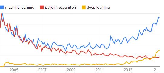 模式识别(Pattern recognition)、机器学习(machine learning)和深度学习(deep learning)代表三种不同的思想流派。模式识别是最古老的(作为一个术语而言,可以说是很过时的)。机器学习是最基础的(当下初创公司和研究实验室的热点领域之一)。而深度学习是非常崭新和有影响力的前沿领域,我们甚至不会去思考后深度学习时代。我们可以看下图所示的谷歌趋势图。可以看到: