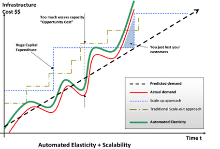 按需部署和弹性是云计算的天然方式(自动弹性),使基础设施与真实需求尽量匹配,因而可以提供资源利用率及压缩成本。