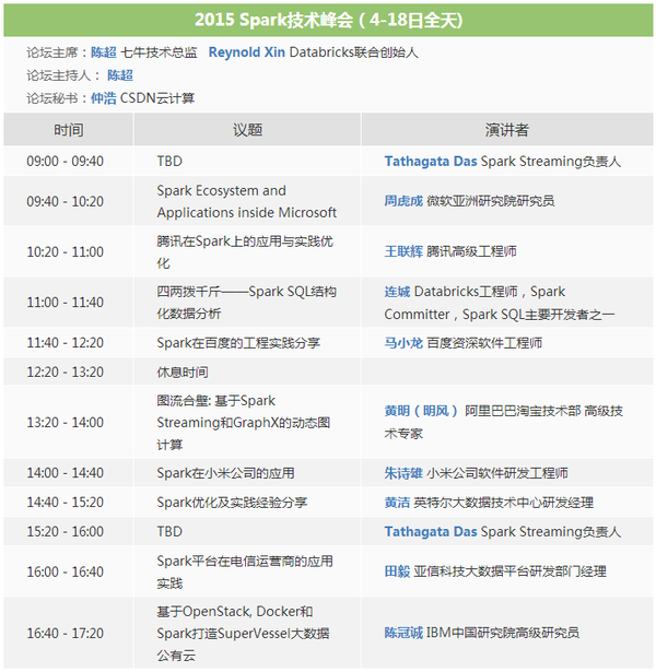 除了陈冠诚,2015 Spark技术峰会已经邀请Spark Streaming负责人Tathagata Das来华,和国内用户分享Spark的技术细节,探讨Spark未来的发展方向,此外还有Databricks、IBM、Intel、微软、百度、阿里、腾讯、亚信等公司的Spark技术实践者,也将同台分享Spark及其相关项目的实战经验。