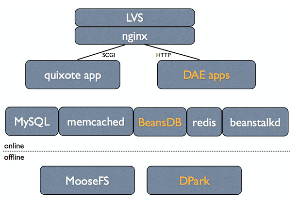 豆瓣整个基础架构可以粗略的分为在线和离线两大块。在线的部分和大部分网站类似:前面用LVS做HA,用Nginx做反向代理,形成负载均衡的一层;应用层主要是做运算,将运算结果返回给前面的用户,DAE平台是这两年建起来的,现在大部分豆瓣的应用基本都跑在DAE上面了;应用后面的基础服务也跟其他网站差不多,MySQL、memcached、redis、beanstalkd,不一样的是NoSQL的选择——BeansDB,这是我们在几年前开源的KV数据库,也是国内比较早开源的KV数据库。